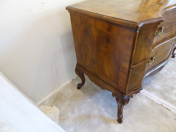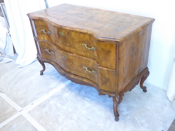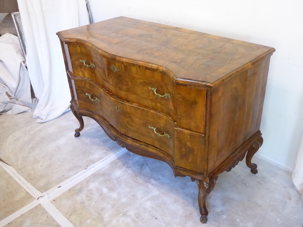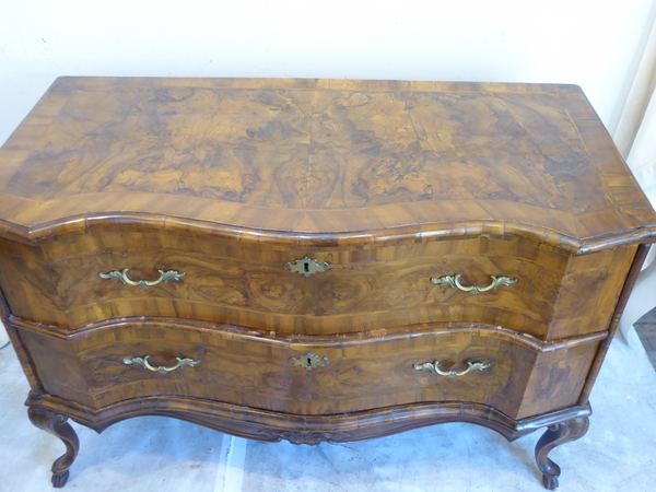 This circa 1800 Italian 2 drawer commode is made of walnut burlwood.