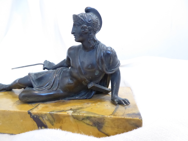 This 19th Century bronze grand tour sculpture of a Greek Warrior is mounted on a rectangle of Siena yellow marble.
