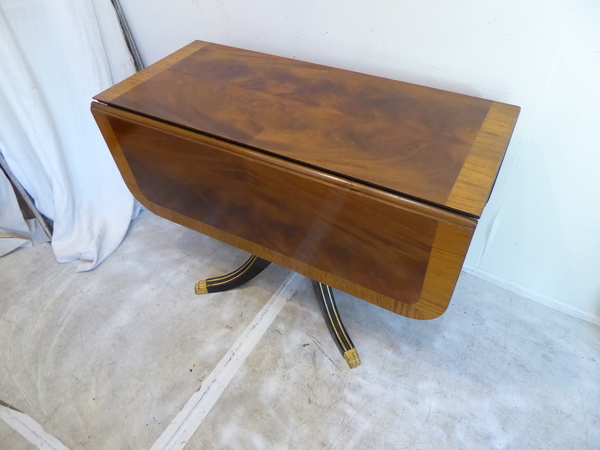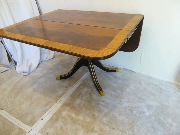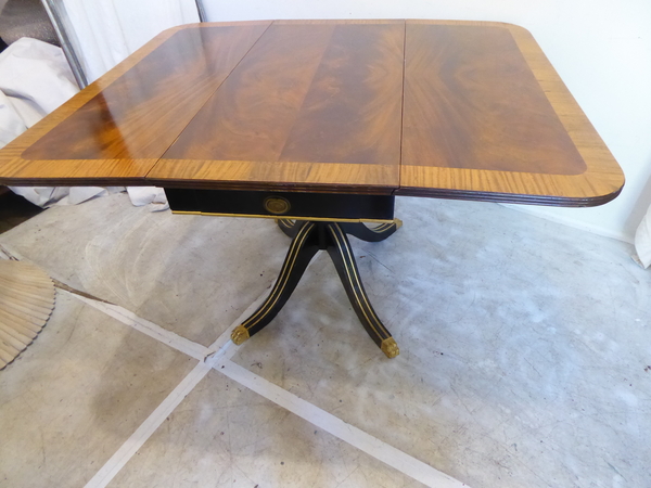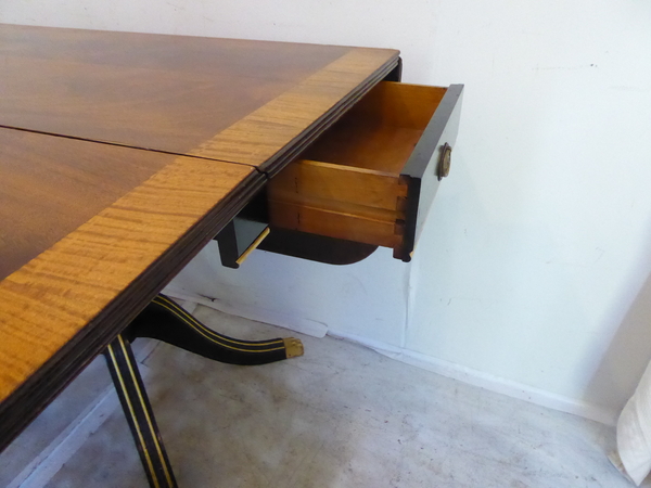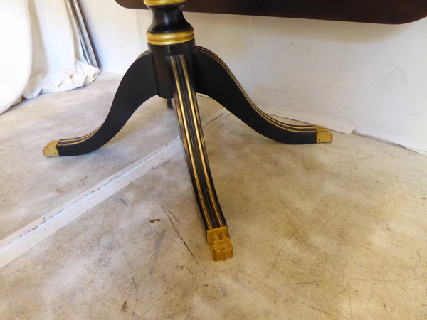 This 20th Century English Regency style console with drop leaves and two drawers in either end, has brass feet and gold leaf details on the legs and drawers. It opens up to 49.5" x 42".