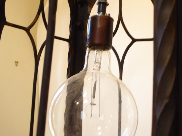 This antique iron lantern has updated wiring and uses a single Edison base bulb up to 100 Watts. It does not have glass panels.