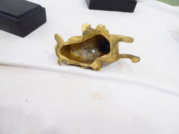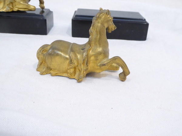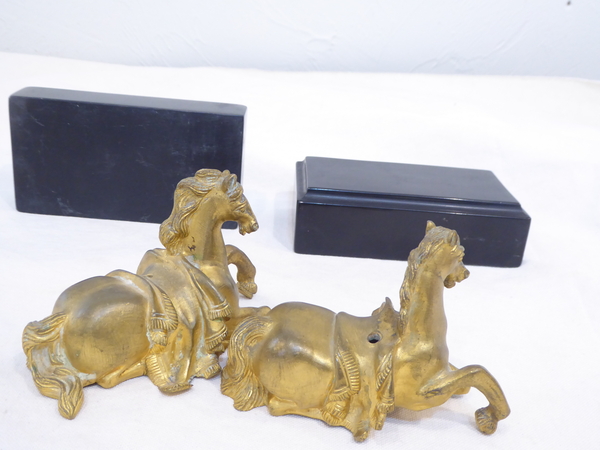This pair of gilded bronze horses sit atop beveled black marble stands.