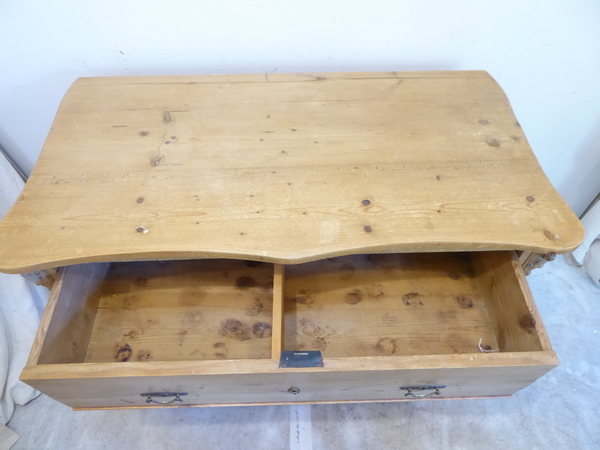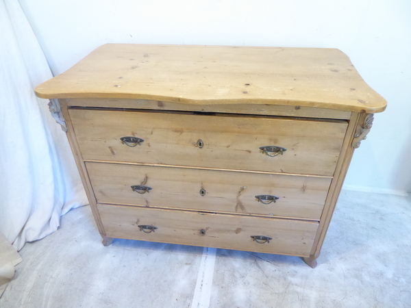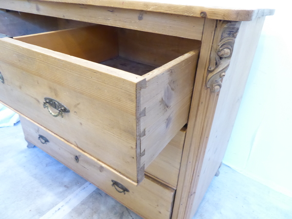 This Antique Scandinavian distressed pine chest of three dove-tailed drawers has a divider in the center of the top two drawers and a small bit of decorative carving.