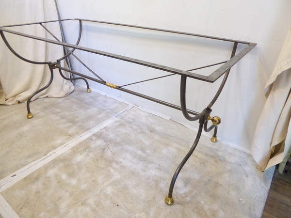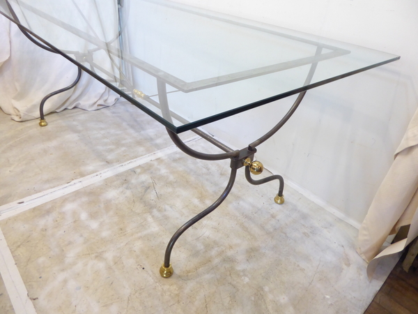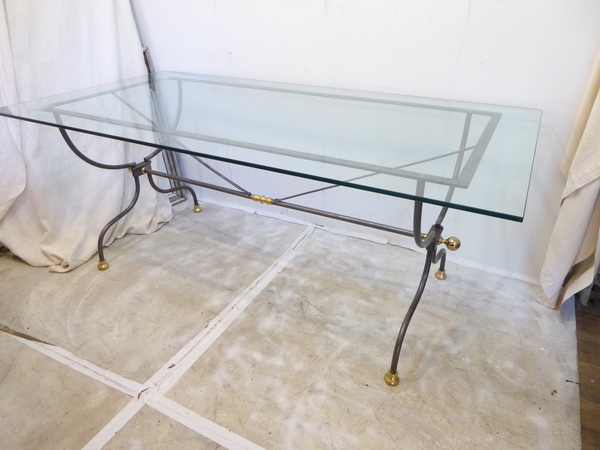 This steel dining table with a glass top was imported from France by the Pierre Deux company in the 20th Century.
