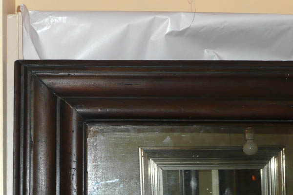 This large simple Italian frame is a rich walnut tone. The molfing is a generous 5.5” wide. It has antiqued, distressed mirror on the interior.
