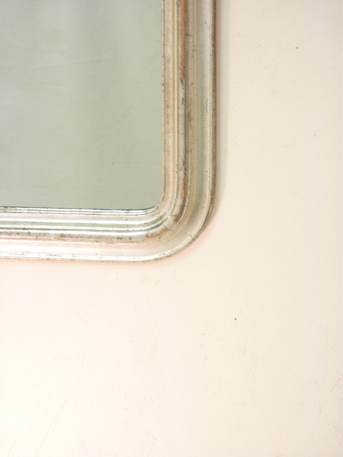 This 19th Century bright silver curved corner mirror has lightly distressed mirror with speckling & clouding.