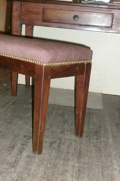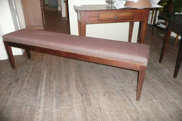 This backless bench with tapered legs with neutral colored upholstery with nail head finishing, is simple and elegant. It is sturdy with pegged construction and a rich patina.
