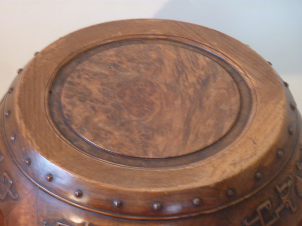 20th Century Chinese hardwood barrel stool with burl-wood top, sturdy, use for seating or as a small table.