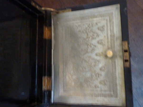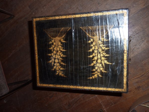 This early 19th century Chinese lacquer tea chest on later stand, has brass handles. The interior is lined with a lidded tin, the top with incised design & ivory handle.