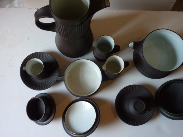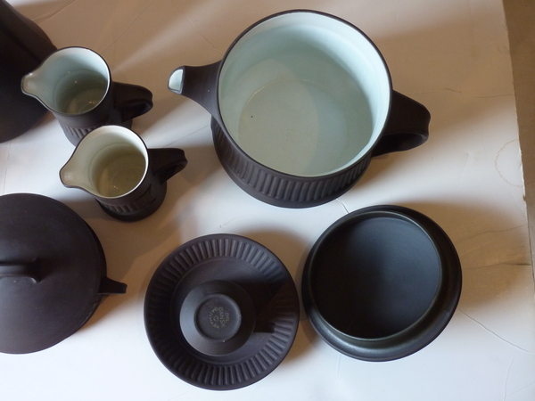 Mid-20th Century Dansk Coffee Service, coffee pot, tea pot, sugar bowl, two creamers, two demi-tasse with saucers.