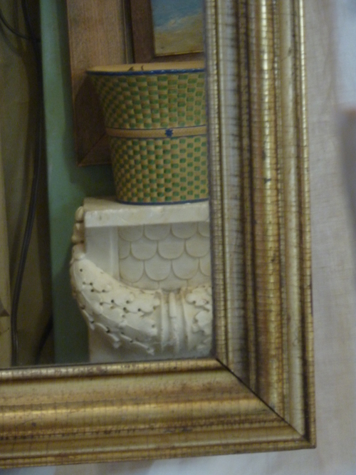 Elongated 19th century silverleaf mirror with gold overtones, crackled finish, lightly distressed mirror with some speckling and clouding.