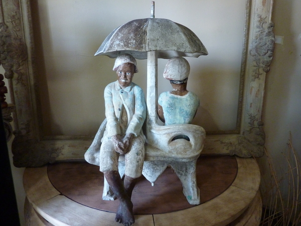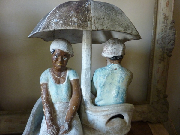 20th C. Concrete sculpture of man & woman sitting in a tete-a-tete with umbrella. Figures are made separately from seat, umbrella lifts off.
