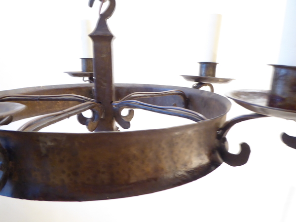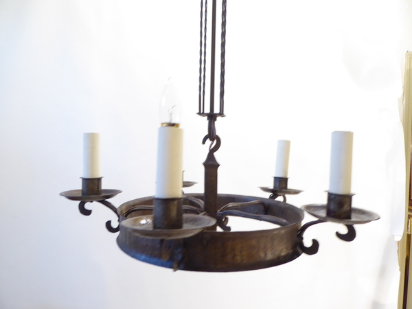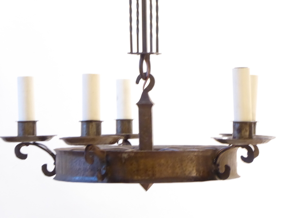 Early 20th Century hammered iron 5 arm Arts & Crafts chandelier, wiring in good condition, use up to 60 watt Edison base bulbs.