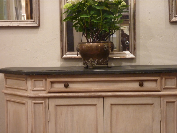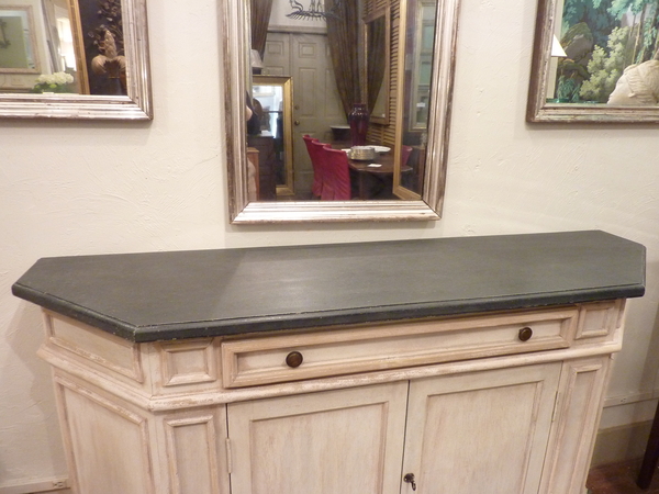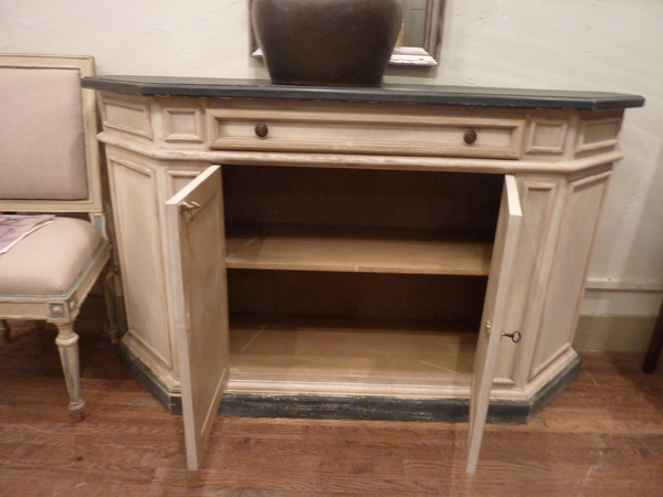 20th century Italian made, cut corner buffet, painted in off white, beige and slate blue.