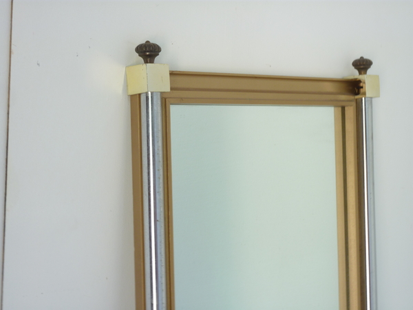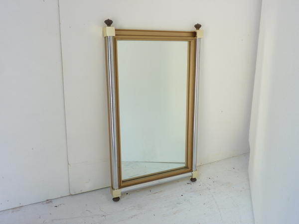 Modern chrome mirror with brass block corners and darkened brass finials, wood frame foundation. (Maine)