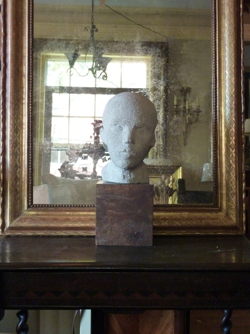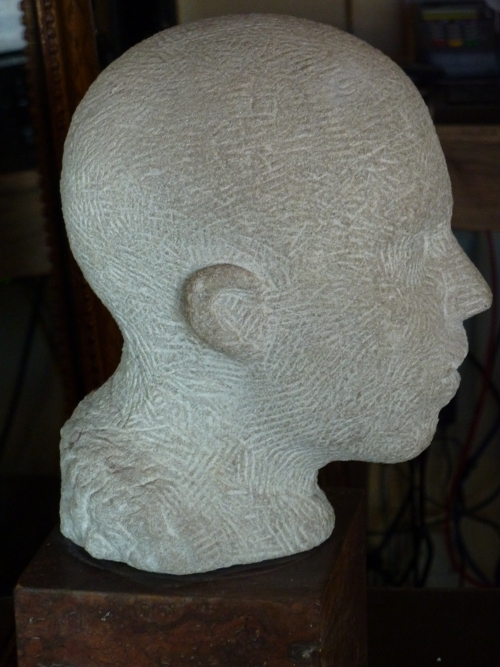 This circa 1950 roughly carved stone bust of a young man is mounted on a block of walnut burlwood. The head alone measures 10” H.