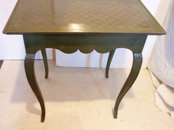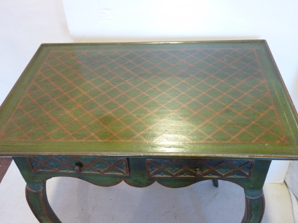 This early 19th century French or Italian tray top table with scalloped apron, is well constructed with pegged joints. There are two drawers, the top is painted in a cross hatch pattern.