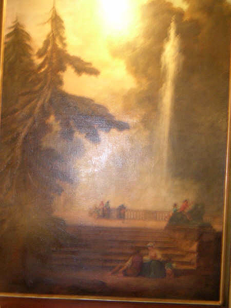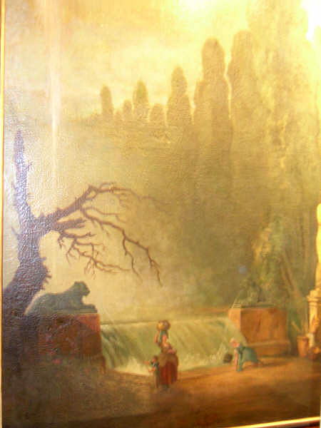 These are a turn of the century monumental pair of oils on canvas of a royal garden, executed in the manner of 18th century master, Hubert Robert. Freely painted scenes of peasants doing their chores, with their children playing around them in a formal garden with fountains and sculpture. The large trees and sky dominate the canvas. The frames are a sage tone with gold trim. The paintings have been cleaned and are in good condition.