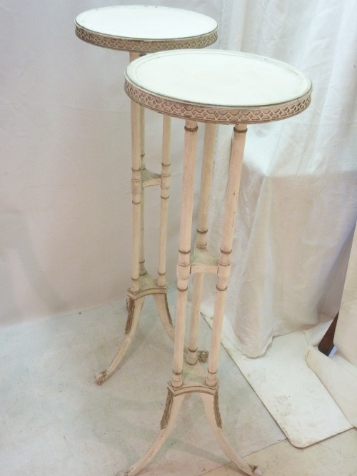 Mid-Century Regency style faux bamboo stands, whitewashed, top diameter 14”.