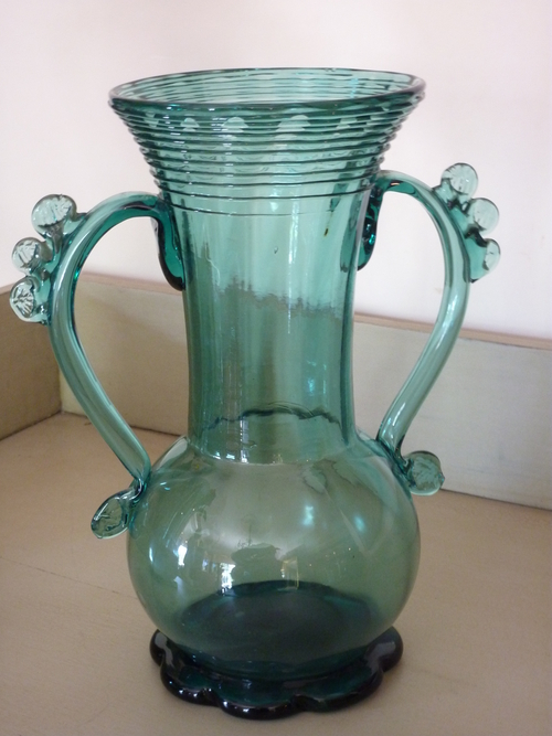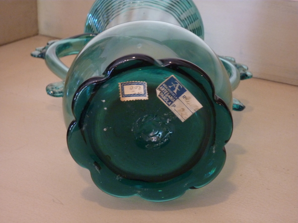 Early 20th Century handblown green glass vases with original label on bottom. Priced for the pair.