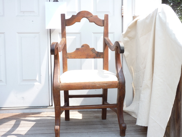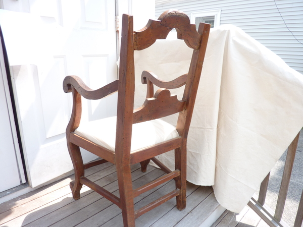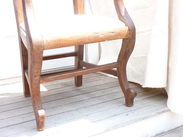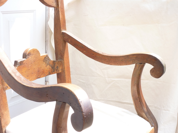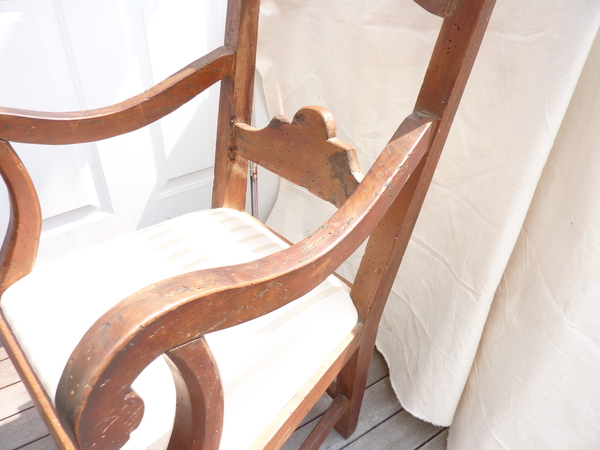 18th Century Italian walnut rustic armchair, the seat upholstered, weathered condition, seat height 18.5”.