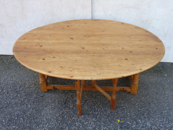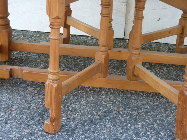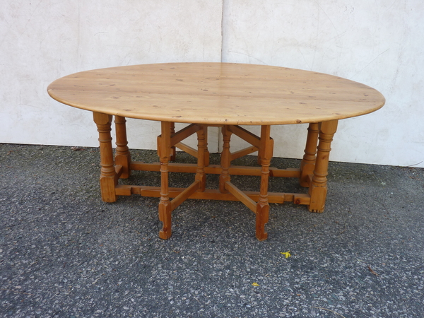 Scandinavian pine coffee table with turned legs, opens to a generous oval shape, well constructed with pegged joints.