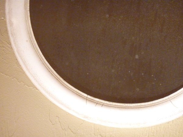 This small vintage wooden round, whitewashed mirror has antiqued, distressed glass.