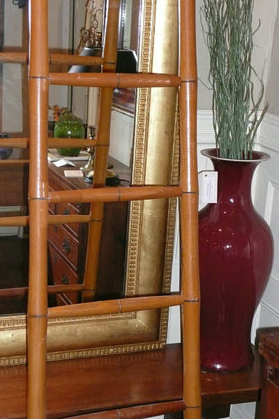 This faux bamboo library ladder is equipped with metal hooks at the top to secure it. It is well made and usable.